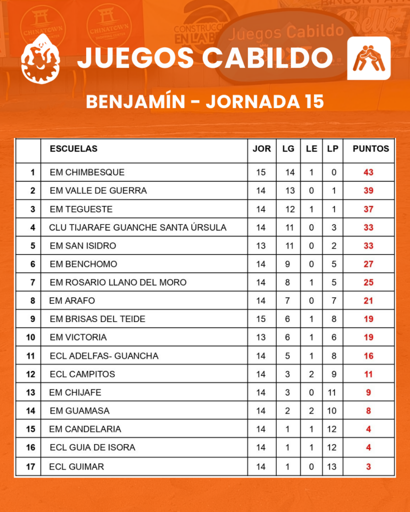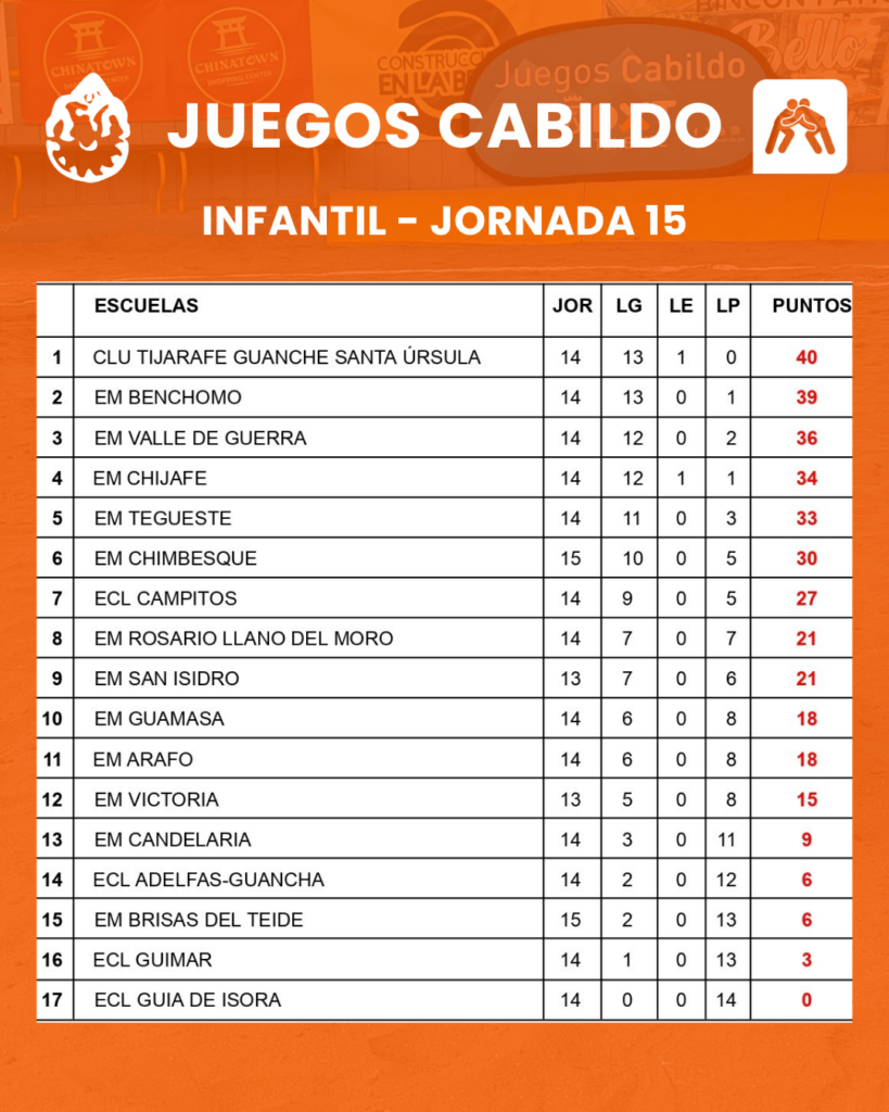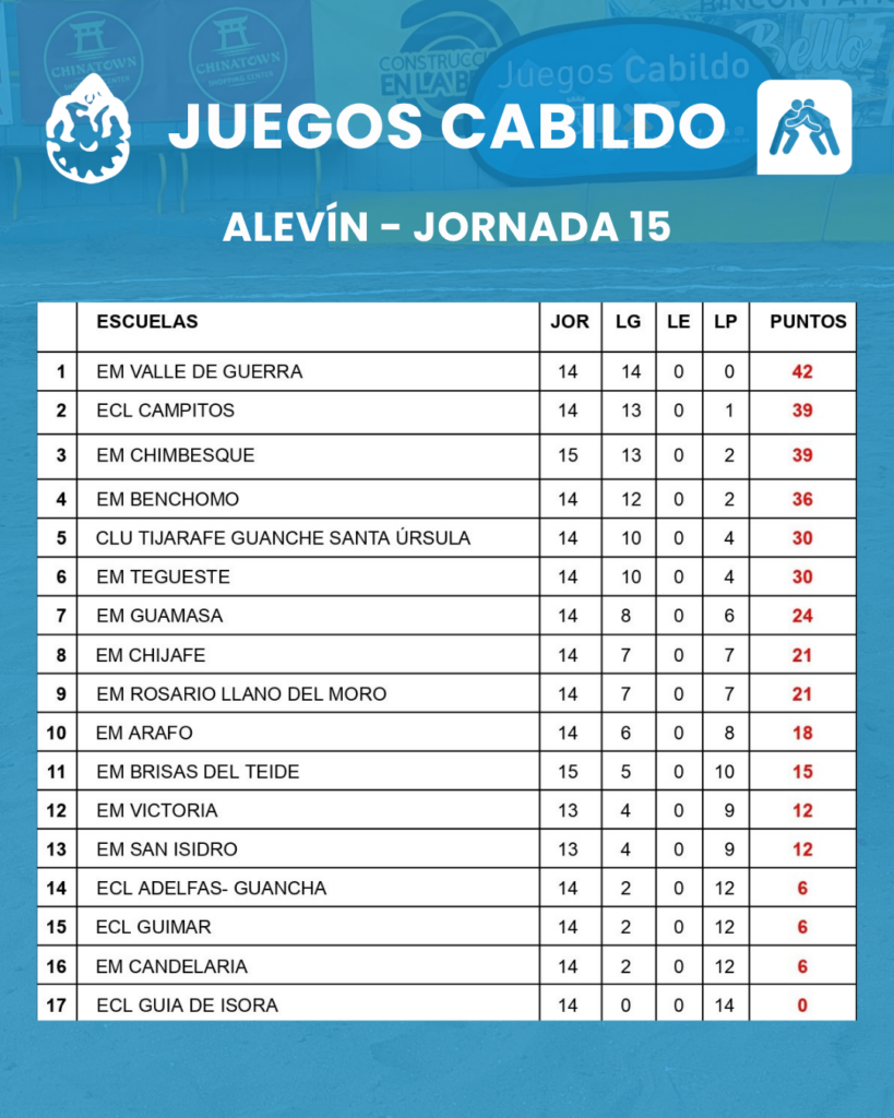 Así marchan las clasificaciones de los Juegos Cabildo, después de la disputa de la 15ª jornada en las categorías infantil, alevín, benjamín y prebenjamín